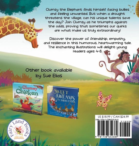 Immerse Your Child in The Heartwarming Rhyming Tale of Clumsy, The Adorable Elephant. This whimsically illustrated book is filled with engaging verse and enchanting artwork, making it an enjoyable and educational read. Clumsy faces bullying and feels unwanted. But when a drought threatens the village, Clumsy's courage and kindness propel him on an extraordinary journey to find water and save the animals. Parents will appreciate the life lessons woven throughout this enchanting tale, focusing on empathy, self-worth, and resilience. Through Clumsy's journey, children learn that true worth comes from the love and compassion within our hearts, and that even in the face of adversity, a kind heart can triumph. Clumsy proves that the most unlikely heroes can make a difference. This is a perfect read for nurturing your child's emotional intelligence and instilling valuable morals. Laugh, learn, and grow together with Clumsy, the adorable elephant. For children ages 4-8
