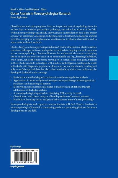 Chapter 1. Introduction.- Chapter 2.Statistical and Methodological Considerations When Using Cluster Analysis in Neuropsychological Research.- Chapter 3: Application of Cluster Analysis to Investigate Neuropsychological Heterogeneity in Psychiatric and Neurological Patients.- Chapter 4. Identifying Neurodevelopmental Stages of Memory from Childhood through Adolescence with Cluster Analysis.- Chapter 5. Classification of traumatic brain injury severity: A neuropsychological approach.- Chapter 6:Concluding Remarks.