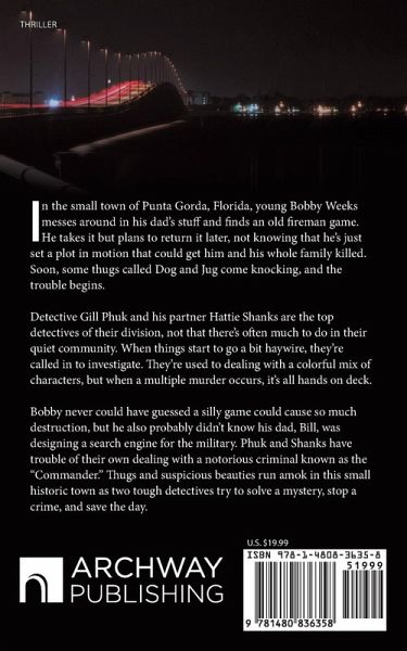 In the small town of Punta Gorda, Florida, young Bobby Weeks messes around in his dad's stuff and finds an old fireman game. He takes it but plans to return it later, not knowing that he's just set a plot in motion that could get him and his whole family killed. Soon, some thugs called Dog and Jug come knocking, and the trouble begins. Detective Gill Phuk and his partner Hattie Shanks are the top detectives of their division, not that there's often much to do in their quiet community. When things start to go a bit haywire, they're called in to investigate. They're used to dealing with a colorful mix of characters, but when a multiple murder occurs, it's all hands on deck. Bobby never could have guessed a silly game could cause so much destruction, but he also probably didn't know his dad, Bill, was designing a search engine for the military. Phuk and Shanks have trouble of their own dealing with a notorious criminal known as the "Commander." Thugs and suspicious beauties run amok in this small historic town as two tough detectives try to solve a mystery, stop a crime, and save the day.