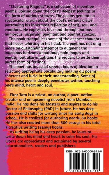 "Clustering Rhymes" is a collection of inventive poems, voicing down the poet’s deepest feelings in the form of various stanzas. The poems generate a spectacular vision about the poet’s various views, portraying his innermost reflection of self, soul and emotions. He expresses his mind through various humorous, inspiring, poignant and painful stanzas. The book tranquilises some of the deepest thoughts that keeps whirling in his head. The poet has not only made an outstanding attempt to augment the ingenious horizons about love, pain, hopes and beauty, but also enlightens the readers to write their purest form of feelings. The poet has invested several hours of ideation in selecting appropriate vocabulary making all poems coherent and lucid in their understanding. Some of his intense poems deeply penetrates within, touching one’s mind, heart and soul.