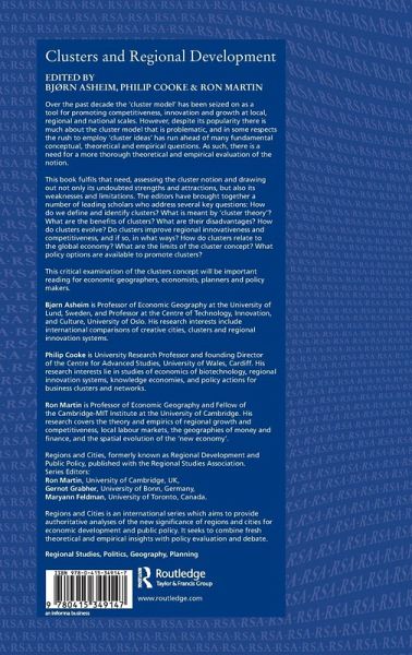 Bjorn Asheim is Professor of Economic Geography at the University of Lund, Sweden, and Professor at the Centre of Technology, Innovation, and Culture, University of Oslo, His research interests include international comparisons of creative cities, clusters and regional innovation systems. Philip Cooke is University Research Professor and founding Director of the Centre for Advanced Studies, University of Wales, Cardiff. His research interests lie in studies of economics of biotechnology, regional innovation systems, knowledge economies, and policy actions for business clusters and networks Ron Martin is Professor of Economic Geography and Fellow of the Cambridge-MIT Institute at the University of Cambridge. His research covers the theory and empirics of regional growth and competitiveness, local labour markets, the geographies of money and finance, and the spatial evolution of the 'new economy'.