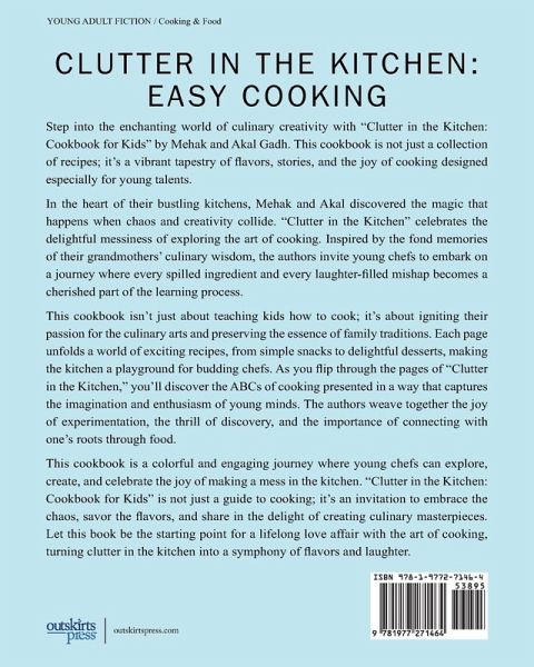 Step into the enchanting world of culinary creativity with "Clutter in the Kitchen: Cookbook for Kids" by Mehak and Akal Gadh. This cookbook is not just a collection of recipes; it's a vibrant tapestry of flavors, stories, and the joy of cooking designed especially for young talents. In the heart of their bustling kitchens, Mehak and Akal discovered the magic that happens when chaos and creativity collide. "Clutter in the Kitchen" celebrates the delightful messiness of exploring the art of cooking. Inspired by the fond memories of their grandmothers' culinary wisdom, the authors invite young chefs to embark on a journey where every spilled ingredient and every laughter-filled mishap becomes a cherished part of the learning process. This cookbook isn't just about teaching kids how to cook; it's about igniting their passion for the culinary arts and preserving the essence of family traditions. Each page unfolds a world of exciting recipes, from simple snacks to delightful desserts, making the kitchen a playground for budding chefs. As you flip through the pages of "Clutter in the Kitchen," you'll discover the ABCs of cooking presented in a way that captures the imagination and enthusiasm of young minds. The authors weave together the joy of experimentation, the thrill of discovery, and the importance of connecting with one's roots through food. This cookbook is a colorful and engaging journey where young chefs can explore, create, and celebrate the joy of making a mess in the kitchen. "Clutter in the Kitchen: Cookbook for Kids" is not just a guide to cooking; it's an invitation to embrace the chaos, savor the flavors, and share in the delight of creating culinary masterpieces. Let this book be the starting point for a lifelong love affair with the art of cooking, turning clutter in the kitchen into a symphony of flavors and laughter.