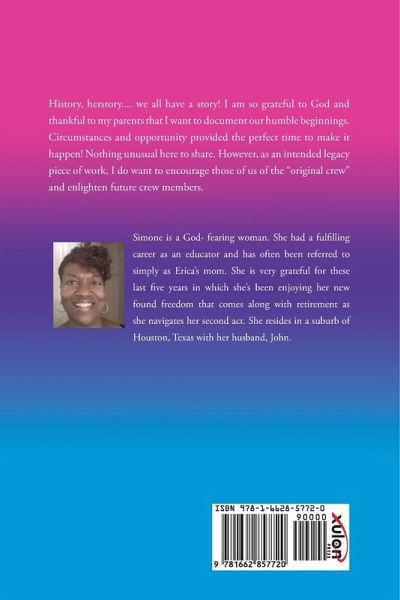 History, herstory.... we all have a story! I am so grateful to God and thankful to my parents that I want to document our humble beginnings. Circumstances and opportunity provided the perfect time to make it happen! Nothing unusual here to share. However, as an intended legacy piece of work, I do want to encourage those of us of the "original crew" and enlighten future crew members. Simone is a God- fearing woman. She had a fulfilling career as an educator and has often been referred to simply as Erica's mom. She is very grateful for these last five years in which she's been enjoying her new found freedom that comes along with retirement as she navigates her second act. She resides in a suburb of Houston, Texas with her husband, John.