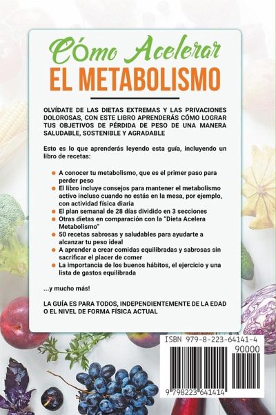 OLVÍDATE DE LAS DIETAS EXTREMAS Y LAS PRIVACIONES DOLOROSAS, CON ESTE LIBRO APRENDERÁS CÓMO LOGRAR TUS OBJETIVOS DE PÉRDIDA DE PESO DE UNA MANERA SALUDABLE, SOSTENIBLE Y AGRADABLE ¿Es posible alcanzar un físico más tonificado y tener el vientre plano solo a través de las elecciones que tomamos en la mesa? ¡Claro que sí! Es bien sabido que no todos tenemos el mismo ritmo cuando tenemos que digerir. Trate de pensar en todas esas personas que pueden permitirse el lujo de comer cualquier basura y en cualquier cantidad permaneciendo siempre y siempre en línea. El secreto de estas personas es un metabolismo rápido. Si estás buscando una forma de lograr un cuerpo más tonificado y tener un vientre plano, la solución puede ser mucho más fácil de lo que piensas. Muchas personas creen que la clave para perder peso es solo el ejercicio, pero la verdad es que la nutrición juega un papel fundamental en nuestro bienestar físico y mental. Si tú también quieres despertar tu metabolismo para mantenerte en línea, entonces esta guía es para ti. Esto es lo que aprenderás leyendo esta guía, incluyendo un libro de recetas:A conocer tu metabolismo, que es el primer paso para perder peso El libro incluye consejos para mantener el metabolismo activo incluso cuando no estás en la mesa, por ejemplo, con actividad física diaria El plan semanal de 28 días dividido en 3 secciones Otras dietas en comparación con la "Dieta Acelera Metabolismo" 50 recetas sabrosas y saludables para ayudarte a alcanzar tu peso ideal A aprender a crear comidas equilibradas y sabrosas sin sacrificar el placer de comer La importancia de los buenos hábitos, el ejercicio y una lista de gastos equilibrada ...y mucho más! La guía "Acelera Metabolismo" no es solo una simple colección de consejos, sino un programa real que te ayudará a alcanzar tus objetivos de forma natural y duradera. Aprenderás sobre tu cuerpo y metabolismo, y aprenderás cómo tomar las decisiones correctas para tu salud y bienestar. LA GUÍA ES PARA TODOS, INDEPENDIENTEMENTE DE LA EDAD O EL NIVEL DE FORMA FÍSICA ACTUAL ¡No pierdas más tiempo, elige el programa "Acelera Metabolismo" y comienza a transformar tu cuerpo hoy mismo!