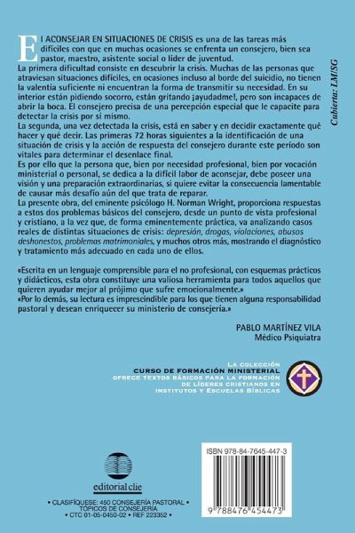 La presente obra enseña cómo descubrir una crisis y una vez detectada cómo decidir exactamente qué hacer y qué decir. Analiza casos reales de distintas situaciones de crisis: depresión, drogas, violaciones, abusos deshonestos, problemas matrimoniales y muchos otros más, mostrando el diagnóstico y tratamiento más adecuado en cada uno de ellos.