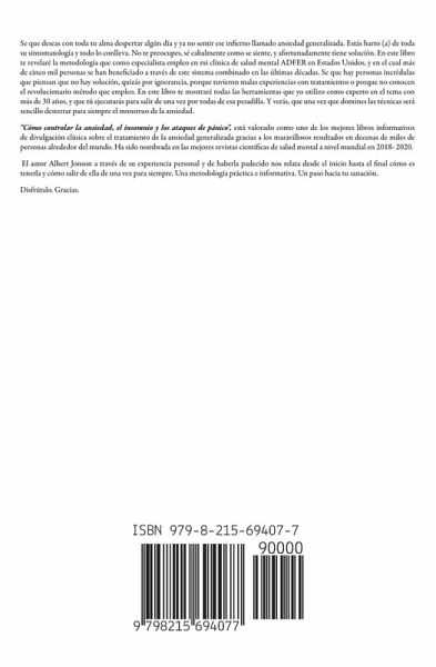 Se que deseas con toda tu alma despertar algún día y ya no sentir ese infierno llamado ansiedad generalizada. Estás harto (a) de toda su sintomatología y todo lo conlleva. No te preocupes, sé cabalmente como se siente, y afortunadamente tiene solución. En este libro te revelaré la metodología que como especialista empleo en mi clínica de salud mental ADFER en Estados Unidos, y en el cual más de cinco mil personas se han beneficiado a través de este sistema combinado en las últimas décadas. Se que hay personas incrédulas que piensan que no hay solución, quizás por ignorancia, porque tuvieron malas experiencias con tratamientos o porque no conocen el revolucionario método que empleo. En este libro te mostraré todas las herramientas que yo utilizo como experto en el tema con más de 30 años, y que tú ejecutarás para salir de una vez por todas de esa pesadilla. Y verás, que una vez que domines las técnicas será sencillo desterrar para siempre el monstruo de la ansiedad. "Cómo controlar la ansiedad, el insomnio y los ataques de pánico", está valorado como uno de los mejores libros informativos de divulgación clínica sobre el tratamiento de la ansiedad generalizada gracias a los maravillosos resultados en decenas de miles de personas alrededor del mundo. Ha sido nombrada en las mejores revistas científicas de salud mental a nivel mundial en 2018- 2020. El autor Albert Jonson a través de su experiencia personal y de haberla padecido nos relata desde el inicio hasta el final cómo es tenerla y cómo salir de ella de una vez para siempre. Una metodología práctica e informativa. Un paso hacia tu sanación. Disfrútalo. Gracias.