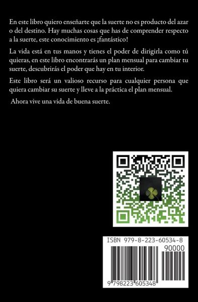 En este libro quiero enseñarte que la suerte no es producto del azar o del destino. Hay muchas cosas que has de comprender respecto a la suerte, este conocimiento es ¡fantástico! La vida está en tus manos y tienes el poder de dirigirla como tú quieras, en este libro encontrarás un plan mensual para cambiar tu suerte, descubrirás el poder que hay en tu interior. Este libro será un valioso recurso para cualquier persona que quiera cambiar su suerte y lleve a la práctica el plan mensual. Ahora vive una vida de buena suerte.