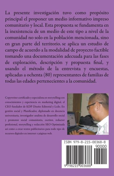 La presente investigación tuvo como propósito principal el proponer un medio informativo impreso comunitario y local. Esta propuesta se fundamenta en la inexistencia de un medio de este tipo a nivel de la comunidad no solo en la población mencionada, sino en gran parte del territorio. se aplica un estudio de campo de acuerdo a la modalidad de proyecto factible tomando una documentación adecuada para las fases de exploración, descripción y propuesta final, y usando el método de la entrevista y encuestas, aplicadas a ochenta (75) representantes de familias de todas las edades pertenecientes a la comunidad.
