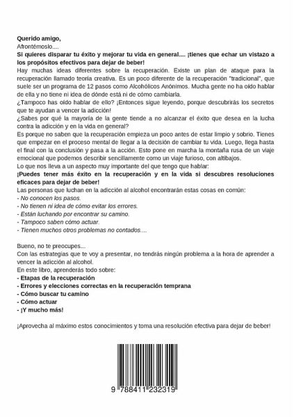 Querido amigo, Afrontémoslo.... Si quieres disparar tu éxito y mejorar tu vida en general.... ¡tienes que echar un vistazo a los propósitos efectivos para dejar de beber! Hay muchas ideas diferentes sobre la recuperación. Existe un plan de ataque para la recuperación llamado teoría creativa. Es un poco diferente de la recuperación "tradicional", que suele ser un programa de 12 pasos como Alcohólicos Anónimos. Mucha gente no ha oído hablar de ella y no tiene ni idea de dónde está ni de cómo cambiarla. ¿Tampoco has oído hablar de ello? ¡Entonces sigue leyendo, porque descubrirás los secretos que te ayudan a vencer la adicción! ¿Sabes por qué la mayoría de la gente tiende a no alcanzar el éxito que desea en la lucha contra la adicción y en la vida en general? Es porque no saben que la recuperación empieza un poco antes de estar limpio y sobrio. Tienes que empezar en el proceso mental de llegar a la decisión de cambiar tu vida. Luego, llega hasta el final con la conclusión y pasa a la acción. Esto pone en marcha la montaña rusa de un viaje emocional que podemos describir sencillamente como un viaje furioso, con altibajos. Lo que nos lleva a un aspecto muy importante del que tengo que hablar: ¡Puedes tener más éxito en la recuperación y en la vida si descubres resoluciones eficaces para dejar de beber! Las personas que luchan en la adicción al alcohol encontrarán estas cosas en común: - No conocen los pasos. - No tienen ni idea de cómo evitar los errores. - Están luchando por encontrar su camino. - Tampoco saben cómo actuar. - Tienen muchos otros problemas no contados.... Bueno, no te preocupes... Con las estrategias que te voy a presentar, no tendrás ningún problema a la hora de aprender a vencer la adicción al alcohol. En este libro, aprenderás todo sobre: - Etapas de la recuperación - Errores y elecciones correctas en la recuperación temprana - Cómo buscar tu camino - Cómo actuar - ¡Y mucho más! ¡Aprovecha al máximo estos conocimientos y toma una resolución efectiva para dejar de beber!