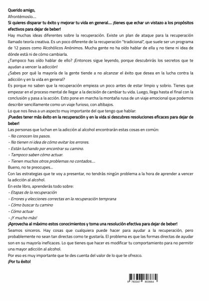 Querido amigo,Afrontémoslo.... Si quieres disparar tu éxito y mejorar tu vida en general.... ¡tienes que echar un vistazo a los propósitos efectivos para dejar de beber!Hay muchas ideas diferentes sobre la recuperación. Existe un plan de ataque para la recuperación llamado teoría creativa. Es un poco diferente de la recuperación "tradicional", que suele ser un programa de 12 pasos como Alcohólicos Anónimos. Mucha gente no ha oído hablar de ella y no tiene ni idea de dónde está ni de cómo cambiarla.¿Tampoco has oído hablar de ello? ¡Entonces sigue leyendo, porque descubrirás los secretos que te ayudan a vencer la adicción!¿Sabes por qué la mayoría de la gente tiende a no alcanzar el éxito que desea en la lucha contra la adicción y en la vida en general? Es porque no saben que la recuperación empieza un poco antes de estar limpio y sobrio. Tienes que empezar en el proceso mental de llegar a la decisión de cambiar tu vida. Luego, llega hasta el final con la conclusión y pasa a la acción. Esto pone en marcha la montaña rusa de un viaje emocional que podemos describir sencillamente como un viaje furioso, con altibajos.Lo que nos lleva a un aspecto muy importante del que tengo que hablar:¡Puedes tener más éxito en la recuperación y en la vida si descubres resoluciones eficaces para dejar de beber!Las personas que luchan en la adicción al alcohol encontrarán estas cosas en común:- No conocen los pasos.- No tienen ni idea de cómo evitar los errores.- Están luchando por encontrar su camino.- Tampoco saben cómo actuar.- Tienen muchos otros problemas no contados....Bueno, no te preocupes...Con las estrategias que te voy a presentar, no tendrás ningún problema a la hora de aprender a vencer la adicción al alcohol.En este libro, aprenderás todo sobre:- Etapas de la recuperación- Errores y elecciones correctas en la recuperación temprana- Cómo buscar tu camino- Cómo actuar- ¡Y mucho más!¡Aprovecha al máximo estos conocimientos y toma una resolución efectiva para dejar de beber!Seamos sinceros. Hay cosas que cualquiera puede hacer para ayudar a la recuperación, pero probablemente no sean tan directas como te gustaría. El problema es que las formas directas de ayudar son en su mayoría ineficaces. Lo que tienes que hacer es modificar tu comportamiento para no permitir una mayor adicción al alcohol.Por eso es muy importante que te des cuenta del valor de lo que te ofrezco.Recuerda que si no actúas hoy, las cosas no mejorarán.... Así que asegúrate de pasar a la acción y hazte con un ejemplar de este libro ahora mismo.¡Por tu éxito!P.D. Tu situación puede no mejorar mañana si no das un paso adelante. ¿Qué es peor? ¿Decirle a la gente que no descubrió formas sencillas de concienciarse sobre cómo mejorar o tomarse un par de días/semanas para aprender la verdad sobre cómo convertirse en lo mejor que puede ser?