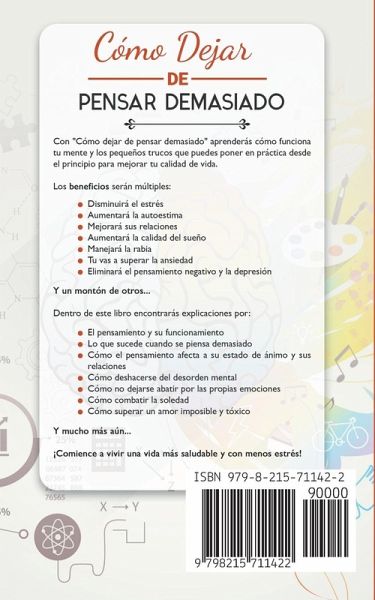LO QUE ESTÁS A PUNTO DE APRNDER PODRÍA CAMBIARTE PARA SIEMPRE Cómo dejar de pensar demasiado: ¡el libro que pone un freno al pensamiento intrusivo! ¿Cómo puedes calmar el incesante zumbido de fondo, controlar tus pensamientos y ponerte en el camino que deseas recorrer? ¿Cuántas veces te ha pasado que después de un largo día finalmente te metiste en la cama y no pudiste dormir porque tu mente estaba llena de pensamientos? Es una de las cosas más frustrantes, ¿verdad? ¿Y si te dijera que puedes poner freno a tu mente y eliminar el estrés y los pensamientos que no te permiten relajarte? Si tú también estás deseando que esto suceda, ¡tengo el libro para ti! Con "Cómo dejar de pensar demasiado" aprenderás cómo funciona tu mente y los pequeños trucos que puedes poner en práctica desde el principio para mejorar tu calidad de vida. Los beneficios serán múltiples:Disminuirá el estrés Aumentará la autoestima Mejorará sus relaciones Aumentará la calidad del sueño Manejará la rabia Tu vas a superar la ansiedad Eliminará el pensamiento negativo y la depresión Y un montón de otros... Dentro de este libro encontrarás explicaciones por:El pensamiento y su funcionamiento Lo que sucede cuando se piensa demasiado Cómo el pensamiento afecta a su estado de ánimo y sus relaciones Cómo deshacerse del desorden mental Cómo no dejarse abatir por las propias emociones Cómo combatir la soledad Cómo superar un amor imposible y tóxico Y mucho más aún... También descubrirás ejercicios para dejar de procrastinar y recuperar el control total de tu vida. Recuerde: su tiempo es demasiado valioso para ser desperdiciado con pensamientos tóxicos que no lo hacen vivir una vida serena y satisfactoria. Comience a vivir una vida más saludable y con menos estrés. ¡La paz mental que estás buscando está a un clic de distancia!