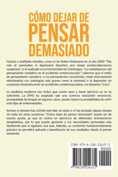 ¿Estás cansado de darle vueltas a la misma idea una y otra vez? Si quieres aprender a lidiar con pensamientos recurrentes, entonces sigue leyendo: Estudios como el de Nolen-Hoeksema, o "La mediatización del pensamiento rumiativo en el accidente cerebrovascular"; han demostrado que el pensamiento rumiativo está relacionado con problemas como la ansiedad, la depresión e incluso accidentes cerebrovasculares. La OMS subraya que una correcta educación emocional puede ser clave para prevenir estas patologías. En este libro descubrirás: Pensamientos recurrentes: identifica sus patrones para poder librarte de ellos. Mindfulness: cómo estar en el momento presente para apartar a tu mente de lo que le hace daño. Reestructuración cognitiva: aprende a cambiar unos pensamientos por otros más beneficiosos. Tipos de terapia: si consideras que la necesitas, sabrás cómo elegir la ayuda profesional más apropiada para tu caso. Hábitos saludables: Sabrás qué debes hacer para minimizar los síntomas y evitar que reaparezcan. Testimonios y casos de éxito: Otros ya han podido, y tú sabrás exactamente cómo lo han conseguido. Práctica y más práctica: contarás con multitud de ejercicios prácticos para aplicar en cada momento de tu proceso. Incluso si has intentado otras terapias sin éxito, este enfoque práctico y basado en múltiples orientaciones terapéuticas puede ajustarse a tus necesidades personales, permitiéndote aplicar ejercicios efectivos desde el primer día. Si deseas liberarte de esos pensamientos de una vez por todas, lee ahora Cómo dejar de pensar demasiado.