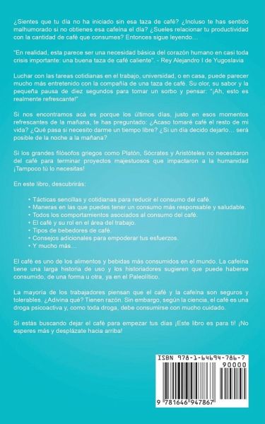 ¿Sientes que tu día no ha iniciado sin esa taza de café? ¿Incluso te has sentido malhumorado si no obtienes esa cafeína el día? ¿Sueles relacionar tu productividad con la cantidad de café que consumes? Entonces sigue leyendo... "En realidad, esta parece ser una necesidad básica del corazón humano en casi toda crisis importante: una buena taza de café caliente". - Rey Alejandro I de Yugoslavia Luchar con las tareas cotidianas en el trabajo, universidad, o en casa, puede parecer mucho más entretenido con la compañía de una taza de café. Su olor, su sabor y la pequeña pausa de diez segundos para tomar un sorbo y pensar: "¡Ah, esto es realmente refrescante!" Si nos encontramos acá es porque los últimos días, justo en esos momentos refrescantes de la mañana, te has preguntado: ¿Acaso tomaré café el resto de mi vida? ¿Qué pasa si necesito darme un tiempo libre? ¿Si un día decido dejarlo... será posible de la noche a la mañana? Si los grandes filósofos griegos como Platón, Sócrates y Aristóteles no necesitaron del café para terminar proyectos majestuosos que impactaron a la humanidad ¡Tampoco tú lo necesitas! En este libro, descubrirás: Tácticas sencillas y cotidianas para reducir el consumo del café. Maneras en las que puedes tener un consumo más responsable y saludable. Todos los comportamientos asociados al consumo del café. El café y su rol en el área del trabajo. Tipos de bebedores de café. Consejos adicionales para empoderar tus esfuerzos. Y mucho más... El café es uno de los alimentos y bebidas más consumidos en el mundo. La cafeína tiene una larga historia de uso y los historiadores sugieren que puede haberse consumido, de una forma u otra, ya en el Paleolítico. La mayoría de los trabajadores piensan que el café y la cafeína son seguros y tolerables. ¿Adivina qué? Tienen razón. Sin embargo, según la ciencia, el café es una droga psicoactiva y, como toda droga, debe consumirse con mucho cuidado. Si estás buscando dejar el café para empezar tus días ¡Este libro es para ti! ¡No esperes más y desplázate hacia arriba!