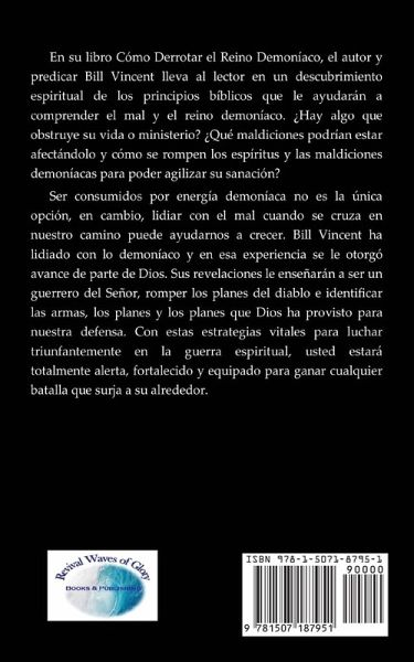 En su libro Cómo Derrotar el Reino Demoníaco, el autor y predicar Bill Vincent lleva al lector en un descubrimiento espiritual de los principios bíblicos que le ayudarán a comprender el mal y el reino demoníaco. ¿Hay algo que obstruye su vida o ministerio? ¿Qué maldiciones podrían estar afectándolo y cómo se rompen los espíritus y las maldiciones demoníacas para poder agilizar su sanación? Ser consumidos por energía demoníaca no es la única opción, en cambio, lidiar con el mal cuando se cruza en nuestro camino puede ayudarnos a crecer. Bill Vincent ha lidiado con lo demoníaco y en esa experiencia se le otorgó avance de parte de Dios. Sus revelaciones le enseñarán a ser un guerrero del Señor, romper los planes del diablo e identificar las armas, los planes y los planes que Dios ha provisto para nuestra defensa. Con estas estrategias vitales para luchar triunfantemente en la guerra espiritual, usted estará totalmente alerta, fortalecido y equipado para ganar cualquier batalla que surja a su alrededor.