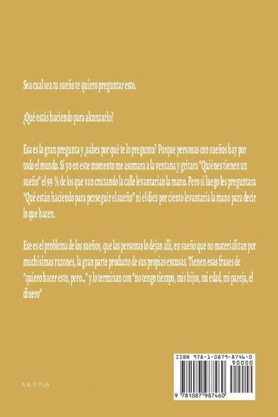 Sea cual sea tu sueño te quiero preguntar esto. ¿Qué estás haciendo para alcanzarlo? Esa es la gran pregunta y ¿sabes por qué te lo pregunto? Porque personas con sueños hay por todo el mundo. Si yo en este momento me asomara a la ventana y gritara "Quiénes tienen un sueño" el 99 por ciento de los que van cruzando la calle levantarían la mano. Pero si luego les preguntara "Qué están haciendo para perseguir el sueño" ni el diez por ciento levantaría la mano para decir lo que hacen. Ese es el problema de los sueños, que las personas lo dejan allí, en sueño que no materializan por muchísimas razones, la gran parte producto de sus propias excusas. Tienen esas frases de "quiero hacer esto, pero..." y lo terminan con "no tengo tiempo, mis hijos, mi edad, mi pareja, el dinero"Locura Es Seguir Haciendo Lo Mismo y Esperar Diferentes Resultados."Albert Eistein"