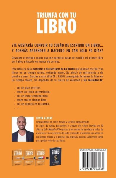 ¿Te gustaría cumplir tu sueño de escribir un libro... y además aprender a hacerlo en tan solo 30 días? Descubre el método exacto que me permitió pasar de escribir mi primer libro en 4 años a hacerlo en menos de 30 días. Gracias a esta GUÍA DE 7 PASOS conseguirás terminar tu libro en un tiempo récord, sin depender de tu fuerza de voluntad y sin necesidad de... - ...ser un gran escritor, - ...tener un título universitario, - ...tener mucho tiempo libre, - ...ser un experto en tu campo, - ... Este libro es para ti si: - Siempre has querido escribir un libro, pero te parece una tarea imposible. - Te gustaría escribir un libro, pero no sabes sobre qué escribir. - Tienes varias ideas sobre las que escribir y no sabes por cuál empezar. - Buscas una nueva vía de ingresos. - Quieres ser reconocido como un experto sobre un determinado tema. - Mandas curriculum tras curriculum y no obtienes respuesta. - Te gustaría ligar más sin tener que apuntarte a clases de salsa y bachata ;) - ... Tu decides: Puedes pasarte el resto de tu vida pensando en ese libro que quieres escribir... o tener tu libro entre tus manos en menos de 30 días.