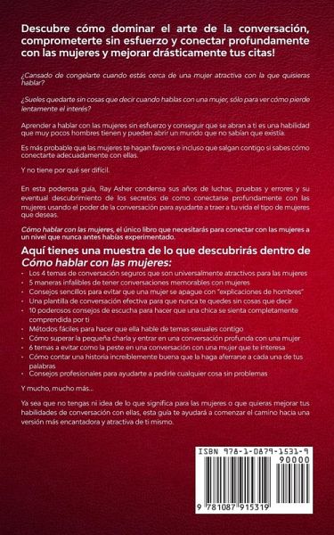 Descubre Cómo Dominar el Arte de la Conversación, Comprometerte Sin Esfuerzo y Conectar Profundamente con las Mujeres y Mejorar Drásticamente Tus Citas! ¿Cansado de congelarte cuando estás cerca de una mujer atractiva con la que quisieras hablar? ¿Sueles quedarte sin cosas que decir cuando hablas con una mujer, sólo para ver cómo pierde lentamente el interés? Si quieres dejar todo esto en tu vida, entonces sigue leyendo... Aprender a hablar con las mujeres sin esfuerzo y conseguir que se abran a ti es una habilidad que muy pocos hombres tienen y pueden abrir un mundo que no sabían que existía. Es más probable que las mujeres te hagan favores e incluso que salgan contigo si sabes cómo conectarte adecuadamente con ellas. Y no tiene por qué ser difícil. En esta poderosa guía, Ray Asher condensa sus años de luchas, pruebas y errores y su eventual descubrimiento de los secretos de como conectarse profundamente con las mujeres usando el poder de la conversación para ayudarte a traer a tu vida el tipo de mujeres que deseas. Cómo Hablar con las Mujeres, el único libro que necesitarás para conectar con las mujeres a un nivel que nunca antes habías experimentado. Aquí tienes una muestra de lo que descubrirás dentro de Cómo Hablar con las Mujeres: * Los 4 temas de conversación seguros que son universalmente atractivos para las mujeres * 5 maneras infalibles de tener conversaciones memorables con mujeres * Consejos sencillos para evitar que una mujer se apague con "explicaciones de hombres" * Una plantilla de conversación efectiva para que nunca te quedes sin cosas que decir * 10 poderosos consejos de escucha para hacer que una chica se sienta completamente comprendida por ti * Métodos fáciles para hacer que ella hable de temas sexuales contigo * Cómo superar la pequeña charla y entrar en una conversación profunda con una mujer * 6 temas a evitar como la peste en una conversación con una mujer que te interesa * Cómo contar una historia increíblemente buena que la haga aferrarse a cada una de tus palabras * Consejos profesionales para ayudarte a pedirle cualquier cosa sin problemas Y mucho, mucho más... Ya sea que no tengas ni idea de lo que significa para las mujeres o que quieras mejorar tus habilidades de conversación con ellas, esta guía te ayudará a comenzar el camino hacia una versión más encantadora y atractiva de ti mismo. ** Bono GRATUITO DE ACCIÓN RÁPIDA: Obtén un recurso simple y poderoso que te ayudará a entender fácilmente, recordar rápidamente y practicar inmediatamente todos tus nuevos conocimientos y habilidades, ¡incluso si tienes ginofobia severa o eres un introvertido! ** Si estás listo para aprender finalmente a hablar con las mujeres sin esfuerzo y atraerlas sin sudar y despedirte de la timidez abruma