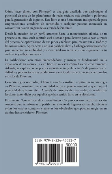 Cómo hacer dinero con Pinterest" es una guía detallada que desbloquea el potencial de una de las plataformas de redes sociales más visuales y poderosas para la generación de ingresos. Este libro es una herramienta indispensable para emprendedores, creadores de contenido y cualquier persona interesada en convertir su pasión en ganancias a través de Pinterest. Desde la creación de un perfil atractivo hasta la monetización efectiva de tu presencia en línea, cada capítulo está diseñado para llevarte paso a paso a través del proceso de optimización de tus pines y tableros para maximizar el tráfico y las conversiones. Aprenderás a utilizar palabras clave y hashtags estratégicamente para aumentar tu visibilidad y a crear tableros temáticos que enganchen a tu audiencia y reflejen tu marca. La colaboración con otros emprendedores y marcas es fundamental en la expansión de tu alcance, y este libro te muestra cómo hacerlo efectivamente. Además, se explora cómo puedes monetizar tu perfil a través de programas de afiliados y promocionar tus productos o servicios de manera que resuenen con los usuarios de Pinterest. Con estrategias avanzadas, el libro te enseña a analizar y optimizar tu estrategia en Pinterest, construir una comunidad activa y generar contenido que tenga el potencial de volverse viral. A través de estudios de caso reales, se revelan las lecciones aprendidas por aquellos que han tenido éxito en la plataforma. Finalmente, "Cómo hacer dinero con Pinterest" te proporciona un plan de acción concreto para transformar tu perfil en una fuente de ingresos sostenible, mientras evitas los errores comunes y superas los obstáculos que puedan surgir en tu camino hacia el éxito en Pinterest.