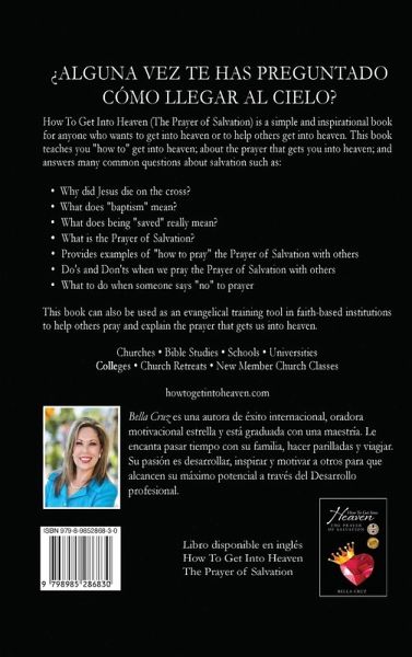 ¿ALGUNA VEZ TE HAS PREGUNTADOCÓMO LLEGAR AL CIELO? Cómo llegar al Cielo (La Oración de Salvación) es un libro sencillo e inspirador para todas las personas que desean llegar al Cielo o ayudar a otras personas a llegar al Cielo. Este libro nos enseña: "cómo" llegar al Cielo; la oración que nos ayuda a llegar al Cielo; y las respuestas a muchas preguntas comunes sobre la Salvación, tales como: · ¿Qué significa el "Bautismo"? · ¿Qué significa realmente la "Salvación"? · ¿Qué es la Oración de Salvación? · Ofrece ejemplos de "cómo rezar" la Oración de Salvación con otras personas · Qué hacer y qué no hacer cuando rezamos la oración de Salvación con otros personas · Lo que debemos hacer cuando alguien se "niega" a rezar Este libro también puede ser usado como herramienta de entrenamiento evangélico en instituciones basadas en la fe para ayudar a otras personas a orar y explicar la oración que nos lleva al Cielo. Iglesias ¿ Estudios bíblicos ¿ Escuelas ¿ Universidades ¿ Escuelas universitarias Retiros de la Iglesia ¿ Clases eclesiásticas para los nuevos miembros Libro disponible en inglés How To Get Into HeavenThe Prayer of Salvation Bella Cruz es una autora de éxito internacional, oradora motivacional estrella y está graduada con una maestría. Le encanta pasar tiempo con su familia, hacer parilladas y viagjar. Su pasión es desarrollar, inspirar y motivar a otros para que alcancen su máximo potencial a través del Desarrollo profesional.