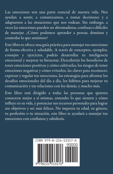 Las emociones son una parte esencial de nuestra vida. Nos ayudan a sentir, a comunicarnos, a tomar decisiones y a adaptarnos a las situaciones que nos rodean. Sin embargo, a veces las emociones pueden ser abrumadoras, confusas o difíciles de manejar. ¿Cómo podemos aprender a pensar, dominar y controlar lo que sentimos? Este libro te ofrece una guía práctica para manejar tus emociones de forma efectiva y saludable. A través de conceptos, ejemplos, consejos y ejercicios, podrás desarrollar tu inteligencia emocional y mejorar tu bienestar. Descubrirás los beneficios de tener emociones positivas y cómo cultivarlas, los riesgos de tener emociones negativas y cómo evitarlos, las claves para reconocer, expresar y regular tus emociones, las estrategias para afrontar los desafíos emocionales del día a día, los hábitos para mejorar tu comunicación y tus relaciones con los demás, y mucho más. Este libro está dirigido a todas las personas que quieren conocerse mejor a sí mismas, entender lo que sienten y cómo influye en su vida, y potenciar sus recursos personales para lograr sus objetivos y ser más felices. No importa tu edad, tu género, tu profesión o tu situación, este libro te ayudará a manejar tus emociones con confianza y sabiduría.