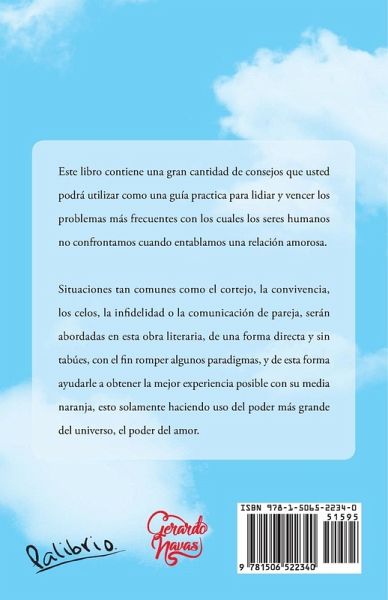 Este libro contiene una gran cantidad de consejos que usted podrá utilizar como una guía practica para lidiar y vencer los problemas más frecuentes con los cuales los seres humanos no confrontamos cuando entablamos una relación amorosa. Situaciones tan comunes como el cortejo, la convivencia, los celos, la infidelidad o la comunicación de pareja, serán abordadas en esta obra literaria, de una forma directa y sin tabúes, con el fin romper algunos paradigmas, y de esta forma ayudarle a obtener la mejor experiencia posible con su media naranja, esto solamente haciendo uso del poder más grande del universo, el poder del amor.