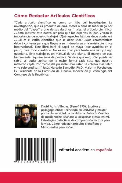 "Cada artículo científico es como un hijo del investigador. La investigación, que es producto de días, meses o años de labor llega por medio del "paper" a uno de sus destinos finales, el artículo científico. ¿Cómo mostrar este nuevo ser para que los expertos lo lean y vean la importancia de nuestro trabajo? ¿Qué aspectos básicos debe contener? ¿Cuál es el estilo científico que se debe usar? ¿Qué características deberá contener para que llegue a ser indexada en una revista científica internacional? Este libro hará el papel de Maya (que ayudaba en el parto) para todo científico. No es un libro para leerlo una vez y luego guardarlo. Este trabajo es un manual de uso diario. El manejo de esta herramienta requiere años de práctica. Se dice que uno, sólo puede ser sabio, al poder aplicar de la mejor forma cada cosa que nuestro intelecto capta. Por medio del presente libro usted se volverá más sabio y no solo erudito..." Jesús Hurtado Zamudio, Ph.D. Major in Psychology Ex Presidente de la Comisión de Ciencia, Innovación y Tecnología del Congreso de la República.