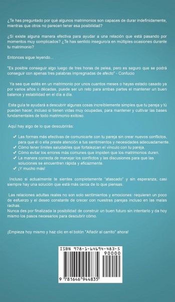 ¿Te has preguntado por qué algunos matrimonios son capaces de durar indefinidamente, mientras que otros no parecen tener esa posibilidad? ¿Si existe alguna manera efectiva para ayudar a una relación que está pasando por momentos muy complicados? ¿Te has sentido inseguro/a en múltiples ocasiones durante tu matrimonio? Entonces sigue leyendo... "Es posible conseguir algo luego de tres horas de pelea, pero es seguro que se podrá conseguir con apenas tres palabras impregnadas de afecto" - Confucio Ya sea que estés en un matrimonio por unos cuantos meses o hayas estado casado ya por varios años o décadas, puede ser un reto para ambas partes el mantener un buen balance y estabilidad en el día a día. Esta guía te ayudará a descubrir algunas cosas increíblemente simples que tu pareja y tú pueden hacer, incluso si tienen vidas muy ocupadas, para mantener y cultivar las bases fundamentales de todo matrimonio exitoso. Aquí hay algo de lo que descubrirás: · Las formas más efectivas de comunicarte con tu pareja sin crear nuevos conflictos, para que él o ella preste atención a tus sentimientos y necesidades adecuadamente. · Cómo tener límites saludables que fortalezcan el vínculo con tu pareja. · Cómo evitar los errores más comunes que impiden que los matrimonios duren. · La manera correcta de manejar los conflictos y las discusiones para que las soluciones se encuentren rápida y eficazmente. · ¡Y mucho más! Incluso si actualmente te sientes completamente "atascado" y sin esperanza, casi siempre hay una solución que está más cerca de lo que piensas. Las relaciones adultas reales no son solo sentimientos y emociones: requieren un poco de esfuerzo y el deseo constante de crecer con nuestras parejas incluso en las malas rachas. Nunca des por finalizada la posibilidad de construir un buen futuro sin intentarlo y da hoy mismo los pasos necesarios para descubrir cómo. ¡Empieza hoy mismo y haz clic en el botón "Añadir al carrito" ahora!