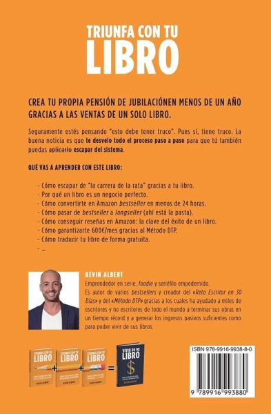 ¿Te gustaría ganar más de 600¿ al mes, todos los meses, gracias a las ventas de tu libro en Amazon? Descubre el sistema que te permitirá crear tu propia pensión de jubilación en menos de un año y con UN SOLO LIBRO. Seguramente estés pensando "esto debe tener truco". Pues sí, tiene truco. La buena noticia es que te desvelo todo el proceso, paso a paso, para que tu también puedas aplicarlo. Este libro es para ti si: - Sueñas con ser autor bestseller. - Te gustaría poder vivir de tu/s libro/s. - Estás harto de tu jefe y te gustaría poder mandarlo a paseo. - Quieres garantizarte una pensión de jubilación digna. - Buscas una nueva fuente de ingresos pasivos. - Has publicado un libro y los resultados no han sido los esperados. - No sabes como vender tu libro. - Necesitas aumentar tus ingresos. - ... Este libro es para escritores y no escritores de NO-FICCIÓN que quieran generar unos ingresos pasivos suficientes como para poder permitirse vivir de su/s libro/s. Como verás, no tienes nada que perder y sí mucho que ganar ;)