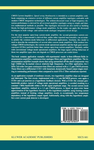 CMOS Current Amplifiers: Speed versus Nonlinearity is intended as a current-amplifier cookbook containing an extensive review of different current amplifier topologies realisable with modern CMOS integration technologies. The seldom-discussed issue of high-frequency distortion performance is derived for all reviewed amplifier topologies using as simple and intuitive mathematical methods as possible. The topologies discussed are also useful as building blocks for high-performance voltage-mode amplifiers. So the reader can apply the discussed techniques to both voltage- and current-mode analogue integrated circuit design.