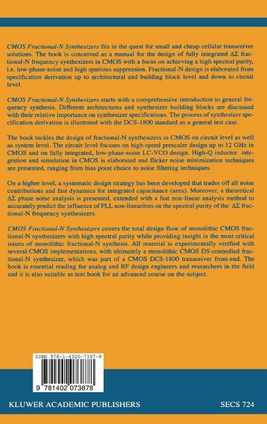 CMOS Fractional-N Synthesizers starts with a comprehensive introduction to general frequency synthesis. Different architectures and synthesizer building blocks are discussed with their relative importance on synthesizer specifications. The process of synthesizer specification derivation is illustrated with the DCS-1800 standard as a general test case.