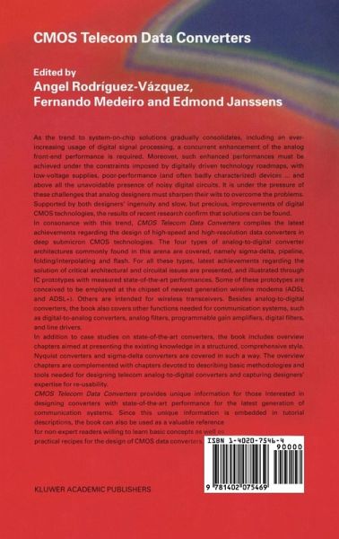 CMOS Telecom Data Converters compiles the latest achievements regarding the design of high-speed and high-resolution data converters in deep submicron CMOS technologies. The four types of analog-to-digital converter architectures commonly found in this arena are covered, namely sigma-delta, pipeline, folding/interpolating and flash. For all these types, latest achievements regarding the solution of critical architectural and circuital issues are presented, and illustrated through IC prototypes with measured state-of-the-art performances. Some of these prototypes are conceived to be employed at the chipset of newest generation wireline modems (ADSL and ADSL+). Others are intended for wireless transceivers. Besides analog-to-digital converters, the book also covers other functions needed for communication systems, such as digital-to-analog converters, analog filters, programmable gain amplifiers, digital filters, and line drivers.