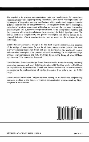 The world of wireless communications is changing very rapidly since a few years. The introduction of digital data communication in combination with digital signal process ing has created the foundation for the development of many new wireless applications. High-quality digital wireless networks for voice communication with global and local coverage, like the GSM and DECT system, are only faint and early examples of the wide variety of wireless applications that will become available in the remainder of this decade. The new evolutions in wireless communications set new requirements for the trans ceivers (transmitter-receivers). Higher operating frequencies, a lower power consump tion and a very high degree of integration, are new specifications which ask for design approaches quite different from the classical RF design techniques. The integrata bility and power consumption reduction of the digital part will further improve with the continued downscaling of technologies. This is however completely different for the analog transceiver front-end, the part which performs the interfacing between the antenna and the digital signal processing. The analog front-end's integratability and power consumption are closely related to the physical limitations of the transceiver topology and not so much to the scaling of the used technology. Chapter 2 gives a detailed study of the level of integration in current transceiver realization and analyzes their limitations. In chapter 3 of this book the complex signal technique for the analysis and synthesis of multi-path receiver and transmitter topologies is introduced.
