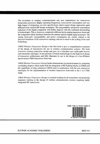 The world of wireless communications is changing very rapidly since a few years. The introduction of digital data communication in combination with digital signal process ing has created the foundation for the development of many new wireless applications. High-quality digital wireless networks for voice communication with global and local coverage, like the GSM and DECT system, are only faint and early examples of the wide variety of wireless applications that will become available in the remainder of this decade. The new evolutions in wireless communications set new requirements for the trans ceivers (transmitter-receivers). Higher operating frequencies, a lower power consump tion and a very high degree of integration, are new specifications which ask for design approaches quite different from the classical RF design techniques. The integrata bility and power consumption reduction of the digital part will further improve with the continued downscaling of technologies. This is however completely different for the analog transceiver front-end, the part which performs the interfacing between the antenna and the digital signal processing. The analog front-end's integratability and power consumption are closely related to the physical limitations of the transceiver topology and not so much to the scaling of the used technology. Chapter 2 gives a detailed study of the level of integration in current transceiver realization and analyzes their limitations. In chapter 3 of this book the complex signal technique for the analysis and synthesis of multi-path receiver and transmitter topologies is introduced.