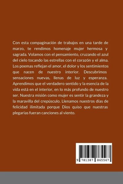 Esta antología internacional pretende realzar el valor de la mujer y rendir homenaje a todas las que están vivas y a las que no lo están. A través de la historia sabemos que desde la antigüedad miles de mujeres postergaron, sueños, anhelos e ilusiones. Porque ser mujer es sinónimo de resiliencia, fortaleza y, sobre todo, confianza: esa confianza que debe manifestarse como propia en cada una de nosotras. Si pensamos en la Biblia debemos decir que la misma invita a la mujer a tomar conciencia de la dignidad que se deriva y el respeto que se merece por el hecho de haber sido creada a imagen y semejanza de Dios. Pues la mujer es lo más sagrado que Dios ha creado.