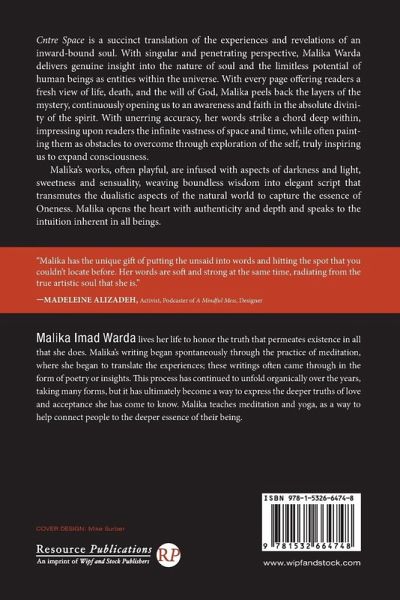 Cntre Space is a succinct translation of the experiences and revelations of an inward-bound soul. With singular and penetrating perspective, Malika Warda delivers genuine insight into the nature of soul and the limitless potential of human beings as entities within the universe. With every page offering readers a fresh view of life, death, and the will of God, Malika peels back the layers of the mystery, continuously opening us to an awareness and faith in the absolute divinity of the spirit. With unerring accuracy, her words strike a chord deep within, impressing upon readers the infinite vastness of space and time, while often painting them as obstacles to overcome through exploration of the self, truly inspiring us to expand consciousness. Malika's works, often playful, are infused with aspects of darkness and light; sweetness and sensuality, weaving boundless wisdom into elegant script that transmutes the dualistic aspects of the natural world to capture the essence of Oneness. Malika opens the heart with authenticity and depth and speaks to the intuition inherent in all beings.