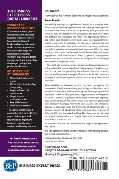 Successfully moving an organization forward is a complex task. Historically professional organizations, like the Project Management Institute, have done a fine job of providing best practices and technical tools to support project managers in the field. These tools will continue to be critical in the future. The opportunity now is to add to that body of knowledge by addressing, more completely, the human experience. In reviewing the literature, practitioners and academics alike have noted that committed teams play an important role in creating exceptional project outcomes. What has been missing is the connection between what's known about employee engagement and commitment, from a general management perspective, and a practical method to integrate that knowledge with project management tools. This book will provide a comprehensive map for project managers to learn about the human experience during a project. It will present specific practices for generating commitment that can be easily incorporated by project managers. The Co-create Model presents a conceptual understanding and a method not currently found in the literature.