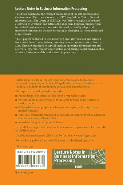 This book constitutes the refereed proceedings of the 15th International Conference on Electronic Commerce, ICEC 2013, held in Turku, Finland, in August 2013. The theme of ICEC 2013 was "effective, agile, and trusted e-services co-creation" and reflects the alignment between computerized, formalized business procedures with the need to flexibly adapt and innovate businesses on the spot according to changing customer needs and requirements.