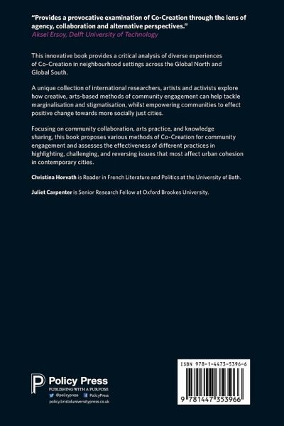 This book analyses a diverse range of experiences of Co-Creation in neighbourhood settings across the Global North and Global South. It brings together a unique collection of researchers, artists, residents and policymakers, all exploring creative ways to address neighbourhood challenges and effect change towards more socially just cities.