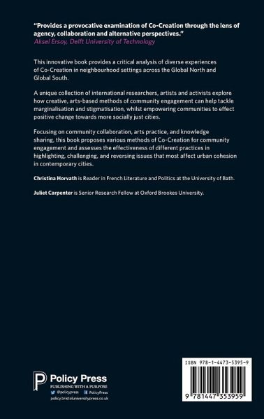 This book explores diverse experiences of Co-creation in neighbourhood settings across the Global North and Global South. Contributors theorise different processes of co-creation for community engagement and assess the effectiveness of these practices in empowering communities. They explore how exclusionary processes affecting the lives of citizens at the margins of urban society can be highlighted, challenged and reversed through community collaboration, arts practice and knowledge exchange.