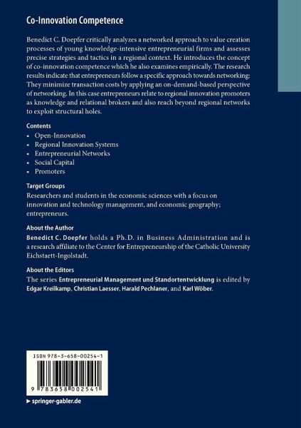This work contributes to entrepreneurship research and offers practical implications for entrepreneurs and entrepreneurship promotors by critically analyzing a networked approach to value creation processes of young knowledge-intensive entrepreneurial firms and assessing precise strategies and tactics for entrepreneurial firms to exploit these structures. In this context the concept of co-innovation competence is introduced and empirically analyzed. Results indicate that entrepreneurs follow a specific approach towards networking minimizing transaction costs taking an on-demand-based perspective of networking. In this case entrepreneurs may relate to regional innovation promotors and also reach beyond regional structures to explore suitable partners and exploit structural holes.