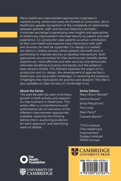 "Many healthcare improvement approaches originated in manufacturing, where end users are framed as consumers. But in healthcare, greater recognition of the complexity of relationships between patients, staff, and services (beyond a provider-consumer exchange) is generating new insights and approaches to healthcare improvement informed directly by patient and staff experience. Co-production sees patients as active contributors to their own health and explores how interactions with staff and services can best be supported. Co-design is a related but distinct creative process, where patients and staff work in partnership to improve services or develop interventions. Both approaches are promoted for their technocratic benefits (better experiences, more effective and safer services) and democratic rationales (enabling inclusivity and equity), but the evidence base remains limited. This Element explores the origins of coproduction and co-design, the development of approaches in healthcare, and associated challenges; in reviewing the evidence, it highlights the implications for practice and research"--