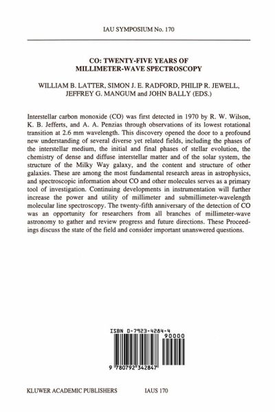 Interstellar carbon monoxide (CO) was first detected in 1970 with the 36 foot diameter telescope of the National Radio Astronomy Observatory! on Kitt Peak in Southern Arizona. R. W. Wilson, K. B. Jefferts, and A. A. Penzias of Bell Labs reported, "We have found intense 2.6 mm line radiation 2 from nine Galactic sources which we attribute to carbon monoxide." Soon afterward, several other basic molecules were also observed in space. IAU Symposium 170, CO: Twenty Five Years of Millimeter Wave Spectroscopy, was organized to commemorate those discoveries. The Symposium reviewed the accomplishments…mehr