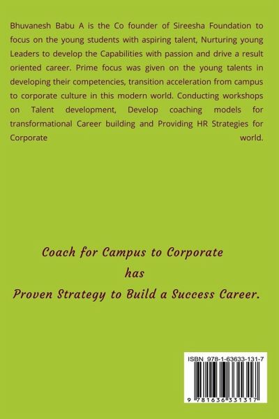 Coach for Campus to Corporate has proven Strategies to build a Success Career This Author has two decades of experience in campus Hiring and the outcome of this book enables the Students to understand their Potentials, Apply techniques to get Hired in faster Phase. Target Audience for the books is the Student who are struggling to get placed in the Campus Placement and Unaware about the Process of Recruitment. The Students, who are with higher ambition want to pursue a career, are landing up in a job to fulfil their Livelihood. Many Corporate Companies hiring the Students for a Job profile are only filling the positions. Career Path for this young generation seems to be dark side, only few students able to successfully upgrade their competencies and develop the career path. This Book focus on the young students with aspiring talent, Nurturing young Leaders to develop the Capabilities with passion and drive a result oriented career. Prime focus was given on the young talents in developing their competencies, transition acceleration from campus to corporate culture in this modern world. Conducting workshops on Talent development, Develop coaching models for transformational Career building and Providing HR Strategies for Corporate world.