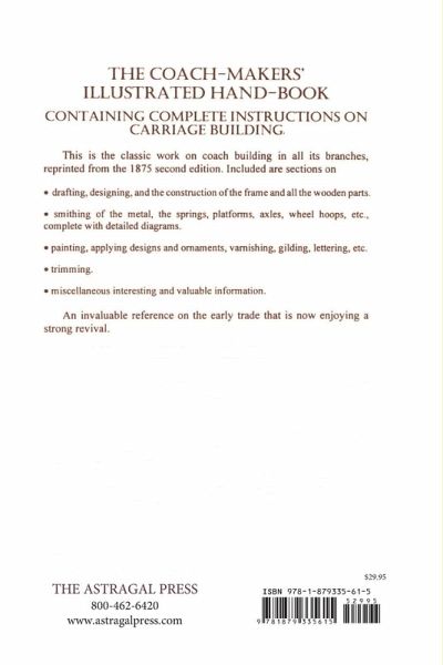 This is the classic work on coach building in all its branches, reprinted from the 1875 second edition. Included are sections on: drafting, designing, and the construction of the frame and all the wooden parts; smithing of the metal, the springs, platforms, axles, wheel hoops, etc., complete with detailed diagrams; painting, applying designs and ornaments, varnishing, gilding, lettering, trimming; other miscellaneous interesting and valuable information. The reader will find this a wonderful reference on an early trade that is now enjoying a strong revival.