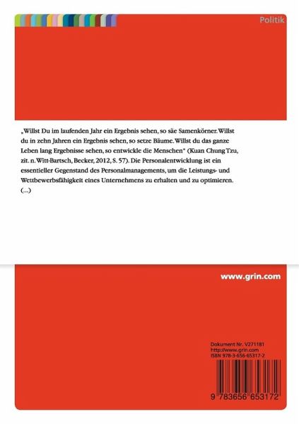Bachelorarbeit aus dem Jahr 2013 im Fachbereich Politik - Sonstige Themen, Note: 1,3, Universität Hamburg (Erziehungswissenschaften), Sprache: Deutsch, Abstract: "Willst Du im laufenden Jahr ein Ergebnis sehen, so säe Samenkörner. Willst du in zehn Jahren ein Ergebnis sehen, so setze Bäume. Willst du das ganze Leben lang Ergebnisse sehen, so entwickle die Menschen" (Kuan Chung Tzu, zit. n. Witt-Bartsch, Becker, 2012, S. 57).Die Personalentwicklung ist ein essentieller Gegenstand des Personalmanagements, um die Leistungs- und Wettbewerbsfähigkeit eines Unternehmens zu erhalten und zu optimieren. Die Nutzung effektiver Instrumente zur Angleichung der Qualifikation der Mitarbeiter an veränderte Arbeitsplatzanforderungen sowie die Erhöhung der Mitarbeiterflexibilität, deren Zufriedenheit und die Befriedigung individueller Bedürfnisse sind dabei wesentliche Bestandteile der Zielverfolgung (vgl. Holtbrügge, 2013, S. 131). Der gegenwärtige permanente Wandel in Wirtschaft und Gesellschaft bietet zahlreiche Chancen und Risiken für die Unternehmen, die es zu erkennen und mit dem wirksamsten Konzept zu bewältigen gilt. Hierbei sollte das Spannungsfeld zwischen den individuellen Bedürfnissen des jeweiligen Mitarbeiters und den Anforderungen des Unternehmens beachtet werden, um alle Parteien zufrieden zu stellen (vgl. Backhausen, Thommen, 2006, S. 21). (...)In der nun vorliegenden Bachelorarbeit"Chancen und Herausforderungen bei der Einführung von Coaching in Unternehmen"werden die Vorzüge von Coaching und die Entscheidungen, die bei der Einführung getroffen werden müssen, herausgearbeitet und kritisch betrachtet. Zum besseren Verständnis dieses Themenkomplexes erfolgt zunächst die Vorstellung des Untersuchungsgegenstandes Coaching in Form einer Begriffserklärung, der Identifikation der Zielgruppe und einer idealtypischen Prozessbeschreibung. Im nächsten Schritt wird der Stellenwert von Coaching im Bereich der Persone Maßnahme dargestellt werden. Ferner wird die Wirksamkeit, insbesondere in Form von Nutzen und Erfolg, von Coaching in Unternehmen beleuchtet und reflektiert, um den Grund für die Entscheidung zur Einführung bzw. die damit verbundenen Vorteile aufzuzeigen. Dass dieser Entschluss mit weitreichenden Entscheidungen und Analysen verbunden ist, ist die Quintessenz des nächsten Abschnittes dieser Bachelorarbeit. Insbesondere stellt die Wahl eines geeigneten Coachs eine große Herausforderung dar, da von ihm der Erfolg des Coachings abhängig ist. Den Abschluss dieser Bachelorarbeit bildet ein Resümee über die gewonnenen Erkenntnisse.