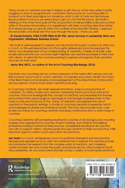 'Jen Gash is well equipped to explore and elucidate this subject as she is an artist and a coach. In this well researched and thoroughly referenced book she explores the history and development of our understanding of creativity. A series of real life case studies demonstrate how coaches might helpfully use creative processes in their work with clients. A useful text for coaches wanting to explore and expand their creativity and use it in their work.' -Jenny Bird, MCC, co- author of The Art of Coaching (Routledge, 2016)