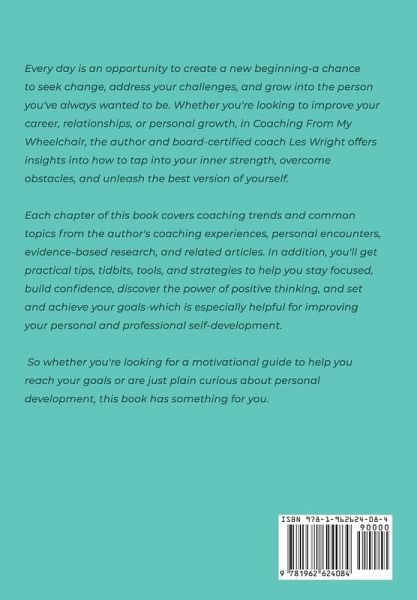 Every day is an opportunity to create a new beginning-a chance to seek change, address your challenges, and grow into the person you've always wanted to be. Whether you're looking to improve your career, relationships, or personal growth, in Coaching From My Wheelchair, the author and board-certified coach Les Wright offers insights into how to tap into your inner strength, overcome obstacles, and unleash the best version of yourself. Each chapter of this book covers coaching trends and common topics from the author's coaching experiences, personal encounters, evidence-based research, and related articles. In addition, you'll get practical tips, tidbits, tools, and strategies to help you stay focused, build confidence, discover the power of positive thinking, and set and achieve your goals-which is especially helpful for improving your personal and professional self-development. This book will provide you with constructive and actionable information on the tools you need to do the following: * Inject some positivity into your life * Crush obstacles with a can-do attitude * Manage changes like a pro * Seek out opportunities to learn and grow * Step outside your comfort zone and take risks * Boost your self-awareness and take control of your life * Create a routine that works for you in just three simple steps * Understand the people around you so you can communicate with them more effectively So whether you're looking for a motivational guide to help you reach your goals or are just plain curious about personal development, this book has something for you.