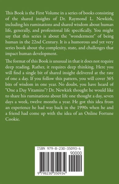 This Book is the First Volume in a series of books consisting of the shared insights of Dr. Raymond L. Newkirk, including his ruminations and shared wisdom about human life, generally, and professional life specifically. You might say that this series is about the "wonderment" of being human in the 22nd Century. It is a humorous and yet very series book about the complexity, state, and challenges that impact human development. The format of this Book is unusual in that it does not require deep reading. Rather, it requires deep thinking. Here you will find a single bit of shared insight delivered at the rate of one a day. If you follow this pattern, you will cover 365 bits of wisdom in one year. No doubt, you have heard of "One a Day Vitamins"? Dr. Newkirk thought he would like to share his ruminations about life one thought a day, seven days a week, twelve months a year. He got this idea from an experience he had way back in the 1990s when he and a friend had come up with the idea of an Online Fortune Cookie.
