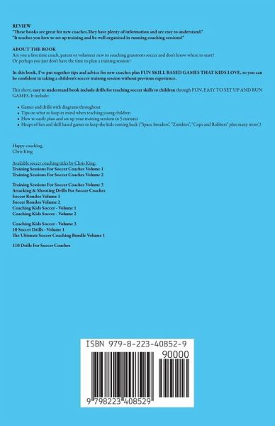 REVIEW "These books are great for new coaches. They have plenty of information and are easy to understand." UK Verified purchase "It teaches you how to set up training and be well organised in running coaching sessions!" USA Verified purchase ABOUT THE BOOK Are you a first time coach, parent, teacher or volunteer new to coaching grassroots soccer and don't know where to start? Or perhaps you just don't have the time to plan a training session? In this book, I've put together tips and advice for new coaches plus FUN SKILL BASED GAMES THAT KIDS LOVE, so you can be confident in taking a children's soccer training session without previous experience. This short, easy to understand book include drills for teaching soccer skills to children through FUN, EASY TO SET UP AND RUN GAMES. It include:Games and drills with diagrams throughout Tips on what to keep in mind when teaching young children How to easily plan and set up your training sessions in 5 minutes Heaps of fun and skill based games to keep the kids coming back ("World Cup", "It's A Knock Off", "Rob The Nest" plus many more)! Happy coaching, Chris King Available soccer coaching titles by Chris King: Training Sessions For Soccer Coaches Volume 1 Training Sessions For Soccer Coaches Volume 2 Training Sessions For Soccer Coaches Volume 3 Attacking & Shooting Drills For Soccer Coaches Soccer Rondos Volume 1 Soccer Rondos Volume 2 Coaching Kids Soccer - Volume 1 Coaching Kids Soccer - Volume 2 Coaching Kids Soccer - Volume 3 10 Soccer Drills - Volume 1 The Ultimate Soccer Coaching Bundle Volume 1 110 Drills For Soccer Coaches A bit about Chris... Chris has played soccer since he was 5 (and still play socially in his late 40s as well as coaching). He has completed coaching courses and coached men, women and children's teams. Chris has released 9 soccer coaching books on Amazon, all aimed at helping coaches improve themselves and their players. His partner also plays soccer, so they stay fit together.