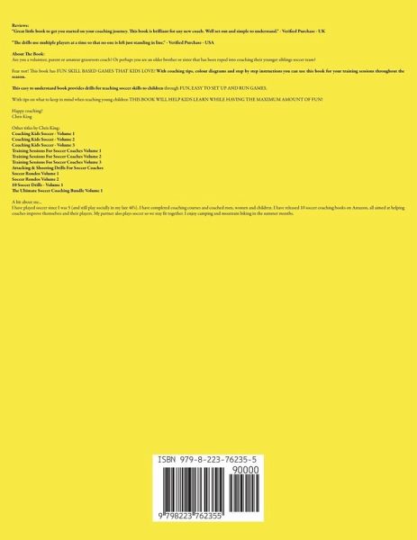 Reviews: "Great little book to get you started on your coaching journey. This book is brilliant for any new coach. Well set out and simple to understand." - Verified Purchase - UK "The drills use multiple players at a time so that no one is left just standing in line." - Verified Purchase - USA About The Book: Are you a volunteer, parent or amateur grassroots coach? Or perhaps you are an older brother or sister coaching their younger siblings soccer team? Then this book is for you! This book has FUN SKILL BASED GAMES THAT KIDS LOVE! With coaching tips, colour diagrams and step by step instructions you can use this book for your training sessions throughout the season. This easy to understand book provides drills for teaching soccer skills to children through FUN, EASY TO SET UP AND RUN GAMES. With tips on what to keep in mind when teaching young children THIS BOOK WILL HELP KIDS LEARN WHILE HAVING THE MAXIMUM AMOUNT OF FUN! Happy coaching! Chris King Other titles by Chris King: Coaching Kids Soccer - Volume 1 Coaching Kids Soccer - Volume 2 Coaching Kids Soccer - Volume 3 Training Sessions For Soccer Coaches Volume 1 Training Sessions For Soccer Coaches Volume 2 Training Sessions For Soccer Coaches Volume 3 Attacking & Shooting Drills For Soccer Coaches Soccer Rondos Volume 1 Soccer Rondos Volume 2 10 Soccer Drills - Volume 1 The Ultimate Soccer Coaching Bundle Volume 1 A bit about me... I have played soccer since I was 5 (and still play socially in my late 40's). I have completed coaching courses and coached men, women and children. I have released 10 soccer coaching books on Amazon, all aimed at helping coaches improve themselves and their players. My partner also plays soccer so we stay fit together. I enjoy camping and mountain biking in the summer months.